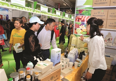 在第十一届中国——东北亚博览会上,我市展出的大米、杂粮杂豆、粘豆包、罐头、肉制品等具有白城特色的商品,深深吸引了前来参观的各地客商和消费者。图为工作人员向消费者介绍镇赉县同村惠民网络科技有限公司展出的镇赉弱碱大米。 本报记者马彬摄
