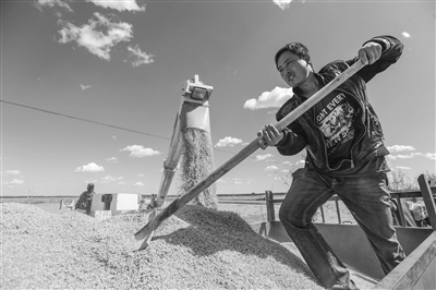 洮南市福顺镇新德村依靠洮儿河水发展水稻种植,因水稻质优而畅销市场。图为9月13日,村民邱雷正在收获今年的水稻。 邱会宁摄