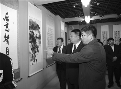 9月30日,由镇赉县委宣传部主办,县文广新局、县文联承办的“聚焦五大攻坚行动,发现镇赉变化之美”主题原创文艺作品展暨“迎国庆,爱家乡”书画摄影展举行,共展出作品150余幅。图为展出现场。 潘晟昱摄