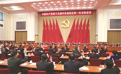 习近平指出,在刚才召开的中共十九届一中全会上,选举产生了新一届中共中央领导机构,全会选举我继续担任中共中央委员会总书记。这是对我的肯定,更是鞭策和激励。