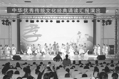 为进一步弘扬中华传统文化,推进社会主义核心价值观建设,10月27日重阳节来临之际,镇赉县组织开展了一场精彩生动的“中华优秀传统文化经典诵读汇报演出”。来自县内百名中小学生以说、唱、诵、演等多种表达方式,为现场观众献上了一场中华经典文化的视听盛宴。图为镇赉县第二实验小学的师生们诵读《百善孝为先》。 李雪阳摄