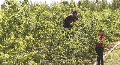 山东省邹平县台子镇沿黄十公里水果长廊种植园的农民在给桃树疏果(5月3日摄)。