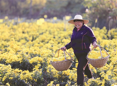 11月5日,在安徽省全椒县石沛镇周岗村,菊农在采摘金丝皇菊。近年来,安徽省滁州市全椒县石沛镇因地制宜,积极发展菊花种植产业。2016年,该镇在种植滁菊的基础上引进金丝皇菊新品种,并与中科院合肥物质科学研究院合作,为菊农提供全程技术指导。经过一年的试种后,石沛镇今年开始大面积推广种植,100多户农民加入合作社,有效实现增收。 新华社发 沈果摄