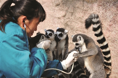 11月21日,在山东青岛森林野生动物世界,一名兽医对环尾狐猴进行听诊检查。