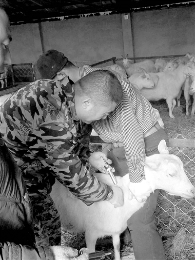 进入冬季昼夜温差较大,为预防冬季动物疫病,日前,通榆县苏公坨乡畜牧兽医技术员来到苏公坨乡奶山羊合作社,给这里的奶山羊注射预防疾病的疫苗,并指导养殖户如何预防、治疗奶山羊冬季易发的普通疾病。图为乡畜牧兽医技术员在给奶山羊注射预防疾病的疫苗。 孙琳琳摄
