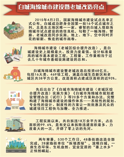 2016年,市委、市政府新一届领导班子高屋建瓴、以民生为重,科学决策——借助海绵城市试点建设契机,创新海绵城市+老城改造的模式,启动实施了总投资68亿元,包括16大类、469项工程,涵盖白城生态新区和老城区共38平方公里,改造面积占建成区面积近90%的老城区综合提升改造工程。