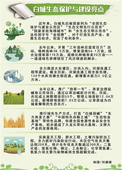 近年来,白城健全完善生态建设制度体系和生态保护法治体系,加快制定地方性法规,依法打击破坏环境的违法行为,保护好来之不易的绿水青山、碧草蓝天——启动推行了“河长制”改革,严格划定生态保护红线;全力配合中央环保督察,办理信访案件373件,责令整改217家,有效解决了群众反映强烈的环保问题;持续开展蓝天、清水、净土“三大环保”行动,市区取缔65座燃煤小锅炉,生态环境持续改善;搞好秸秆露天禁烧和综合利用,加快煤改电、煤改气进程;实施农业面源污染防治,确保农药、化肥零增长。