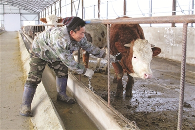 大安市晋元肉牛养殖合作社位于大安市红岗子乡,合作社建设投资200万元,年肉牛出栏500余头。今年,红岗子乡187户贫困户与合作社签订协议,通过政府采购,把用扶贫资金购买的159头肉牛加入合作社托管经营,解决了贫困户养殖难题,实现了稳定创收平稳脱贫。图为工人正在清理牛舍。