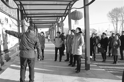 12月12日,白城市“志智双扶·共建美丽乡村”观摩团到镇赉县参观交流。观摩团分别深入到嘎什根乡创业村、镇赉镇架其村两个美丽乡村示范村了解精神文明、美丽乡村建设等方面情况。图为观摩团在创业村参观休闲文化长廊宣传栏。 李雪阳摄
