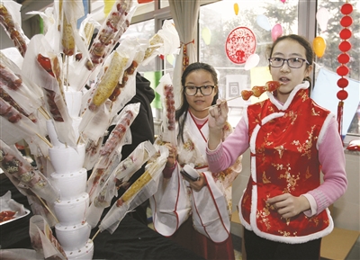 2017年12月29日,在“传统文化庙会——欢乐嘉年华”上,学生们在品尝糖葫芦。