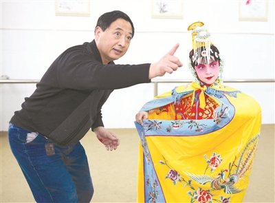 1月2日,西场小学学生在京剧老师的指导下练习京剧表演。