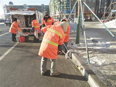 对于因沿街商铺、居民乱倒污水杂物形成的大大小小的积冰,以及结垢污水井、路边石,环卫工人采取喷灯火烤、火碱清洗、撒布融雪剂、镐刨铲除、热水洗刷等方法进行了专项清理。