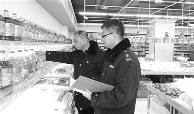 为进一步加强食品安全监管,洮南市市场监管局兴隆管理所以冷冻鲜肉、冷冻速食制品、水产品、粮油、蔬菜、干鲜调味品等节日消费较为集中的品种为重点,提早开展春节市场食品安全检查工作,指导规范经营者落实索证索票、购销台账、进货查验制度,并对销量较大食品进行抽样检测,严防“三无”、过期变质等伪劣食品流入市场,切实保障群众食品消费安全。图为执法人员在食品超市检查桶装食用油。 陶秋宇 本报记者张殿文摄