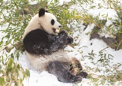 降雪过后,南京红山森林动物园里的大熊猫在雪地里进食、玩耍,享受“戏”雪的快乐。 新华社记者苏阳摄