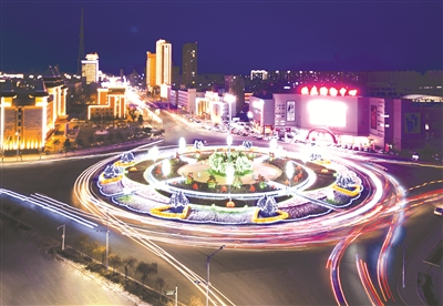 近年来,以白城经开区吉鹤广场为代表的亮化工程,给全市人民留下了极为深刻的印象。吉鹤广场那璀璨的灯光,如五彩缤纷的光河在流淌,在50余种20000余个灯具的点缀下,整个圆形广场如同一个硕大的翡翠玉盘,成为我市一道靓丽的风景。图为吉鹤广场鸟瞰。 邰守震 本报记者李晓明摄