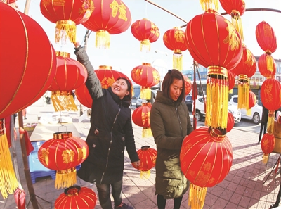 春节临近,我市各地节日气氛浓烈,象征喜庆吉祥的大红灯笼购销两旺。图为通榆县居民正在年货市场上挑选灯笼。 本报记者李晓明摄