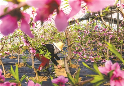 2月24日,河北省涿州市东城坊镇三城村村民在大棚内放置蜂箱,为桃花授粉。