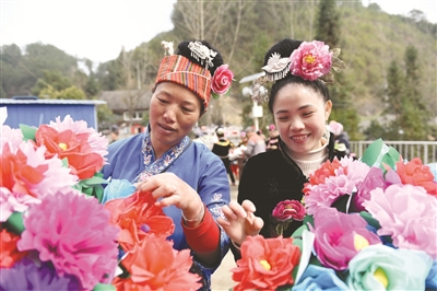2月25日,在贵州省台江县抬拱街道温泉村大德苗寨,村民在整理装饰彩龙的纸花。