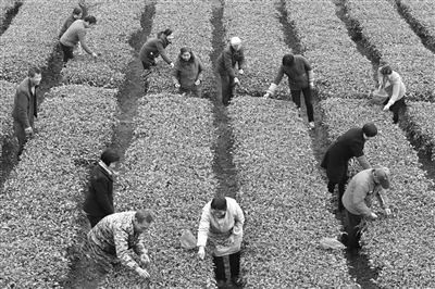 3月9日,在湖北宜昌秭归县茅坪镇中坝子村茶园,茶农正在采摘春芽。当日,地处三峡库区的湖北省宜昌市秭归县早春茶正式开园,吸引众多游客前来参与采摘、品评、选购。