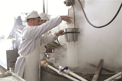 通榆县新华镇育林村探索“扶贫科技小院+帮扶单位+企业+合作社+农户”模式,依托育林米面加工有限公司,发展粉条、淀粉等农产品深加工产业,在提高农产品附加值的同时,又吸纳本村贫困户到企业打工,加快全村脱贫致富步伐。图为育林米面加工有限公司的工人在制作手工粉条。 本报记者马彬摄