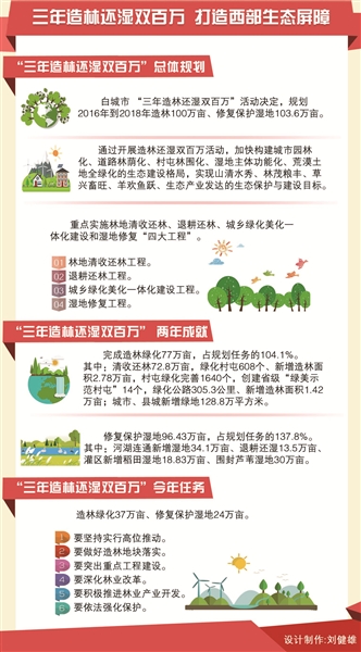 人们用“草原明珠”来形容白城这座塞外草原小城。究其原因,很大程度上是因为这里秀美的山水,代表了人们对神秘绿色草原的向往和礼赞。数百年的发展史,这座城市发生了翻天覆地的变化。而唯独不变的,是它一脉相承的绿水青山——2016年初,新一届市委、市政府深入贯彻落实生态文明建设和绿色发展理念,把生态建设摆在“十三五”规划的“四项重点工作”之首予以高度重视,在总结两个“三年大造林”活动成果和经验的基础上,大坐标审视,大手笔勾勒,作出了“三年造林还湿双百万”的战略部署。这是白城造林绿化建设的一大力作,是白城科学和谐发展的一大壮举,是保护西部生态进而构建吉林省西部生态屏障的一场决战。