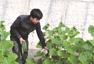 镇赉县镇赉镇南岗村以大棚蔬果种植远近闻名,生产的蔬菜占镇赉县市场50%的份额。全村共有蔬果大棚1000余栋,每栋建设面积500平方米,年产值达1000余万元。图为4月13日村民高立强在自家大棚里采摘成熟的黄瓜。
