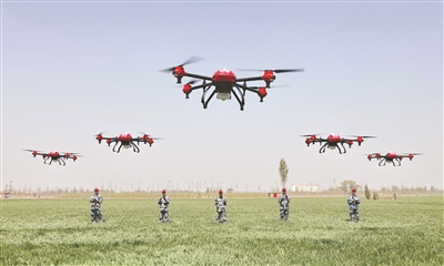 正值小麦春管时节,河北省临漳县在小麦绿色高产高效创建示范区利用植保无人机进行作业。 新华社记者牟宇摄