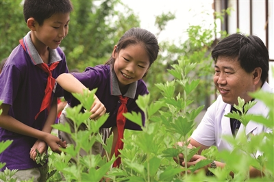 5月15日,在河北沧州一中药种植基地,中医周红军指导小学生认识中药材艾草。