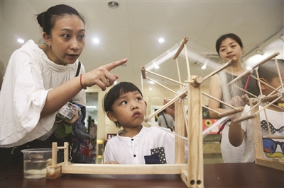 5月20日,在西南大学家蚕基因组生物学国家重点实验室,一名小朋友在家长的陪同下体验蚕茧缫丝工艺。