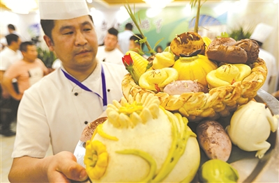 当日,山东省沂南县举行旅游美食大赛,当地特色农家乐和知名餐饮企业的120多位厨师参加了热菜、凉菜、面点等项目的比拼,现场展示了200多道特色菜品。此次大赛旨在提升当地旅游餐饮服务水平,推动旅游产业快速发展。 新华社王彦冰摄