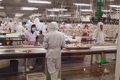 2016年以来,大安市安大牧业有限责任公司通过产业发展和政府政策扶植,采用“公司+合作社+养殖大户+贫困户”的企业扶贫模式,通过百栋鸡舍项目带动2428户贫困户,实现增收1887.7万元,户均年增收7800元。图为安大牧业有限责任公司工人在流水线上工作。 本报记者马彬摄