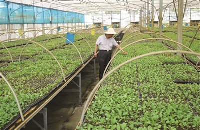6月7日,在“云厨一站”育苗基地,工作人员在查看蔬菜幼苗生长情况。