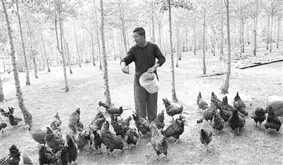 洮北区洮河镇楚伦村村民刘军利用林地养殖林下鸡,取得了良好的经济效益。为有效带动贫困户,他成立了洮北区多琪林地养殖专业合作社,每年帮助全村贫困户每户增收1000余元。 本报记者张殿文摄
