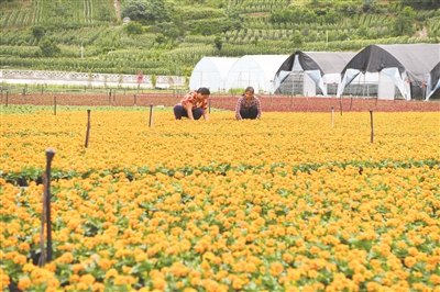 6月12日,艳山红村村民在村里的花卉基地劳作。