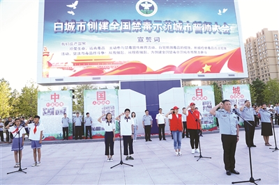 为严厉打击毒品犯罪活动,教育群众珍爱生命、拒绝毒品,在全社会形成自觉抵御毒品侵害、坚决参与禁毒斗争的良好氛围,6月23日,我市召开创建全国禁毒示范城市誓师大会。各企事业代表,各中小学、大专院校师生代表,以及志愿者代表共千余人参加。会后,与会人员还参加了禁毒宣传和签名活动。此次创建全国禁毒示范城市,是继我市“四城联创”后又一重要的国家级品牌城市争创活动。图为誓师大会现场。 本报记者张殿文摄