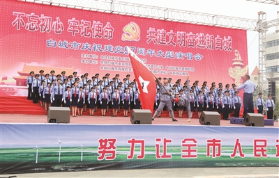 活动现场人头攒动,鲜红的舞台背景上写着“不忘初心 牢记使命 共建文明奋进新白城”的字样,现场秩序井然,观众人人手持五星红旗,欢聚在此,共同为中国共产党“庆生”。