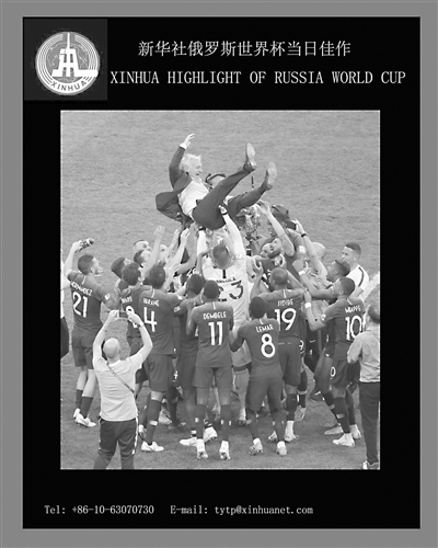 7月15日,法国队球员在比赛后抛起主教练德尚(上)庆祝胜利。