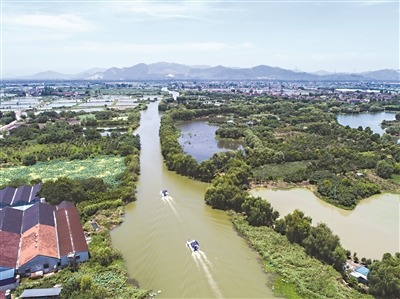 在浙江省湖州市东林镇保健村的河道上,河长及工作人员乘船巡河。