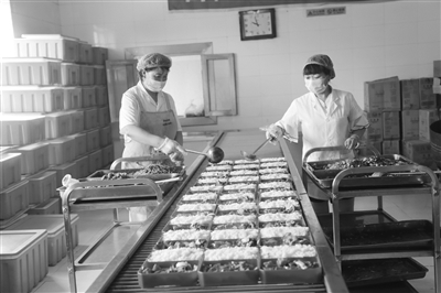 吉米凯餐饮服务有限公司是白城市工业园区招商企业,自2015年正式生产以来,一直秉承“诚信为本,品质第一,顾客满意”的服务宗旨,广泛服务于社会,每天为30余家企事业单位、1000余人提供优质高效的餐饮服务。安置20多名工人在此就业,取得了经济效益与社会效益双丰收。图为工人们正在用无毒环保的包装盒盛装饭菜,确保客户吃得放心。 本报记者张殿文摄