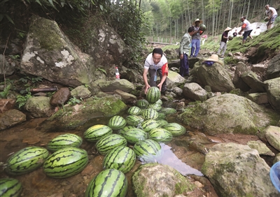 7月21日,工作人员在常绿镇的竹林溪流中放置西瓜,作为清凉水果提供给游客。