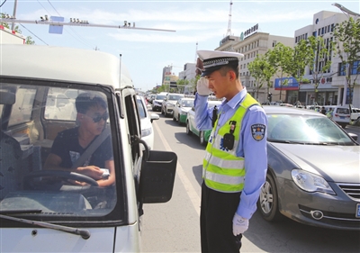 在市区中兴西大路路口,交警小刘正在指挥交通,由于正是中午上班时间,过往车辆非常多,小刘一个人既忙着指挥交通,又忙着疏导车辆,额头上的汗流进眼睛里……