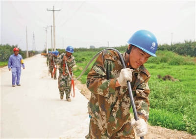 7月29日,国网晋州市供电公司的工人在东里庄镇北小吾村农网升级改造现场工作。