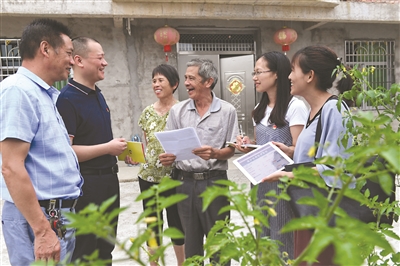 7月31日,永泰县盘谷乡纪检干部在精准扶贫户方来修(右三)家门前了解帮扶脱贫情况。