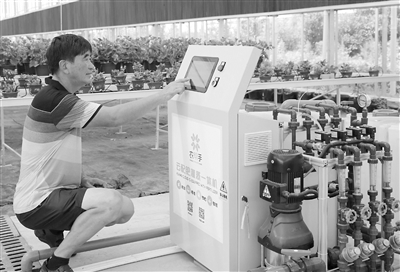 7月30日,在江苏省海安市雅周镇雨研科技智慧农业示范园,工作人员检查云配肥灌溉一体机运行情况。