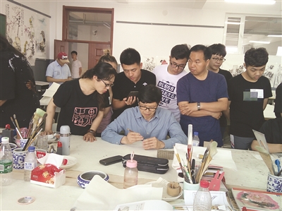 应同学们的热情要求,陈民为40多位同学设计印稿,亲切而幽默地对学生们说:“同学们回去后,可要认真将今天学到的知识细细‘消化掉’啊,一年后我要来检查作业的。”随后,绍兴、白城书法家们又挥毫题字为师生留念,并把现场拓制的精美印屏赠送给白城师范学院美术学院。