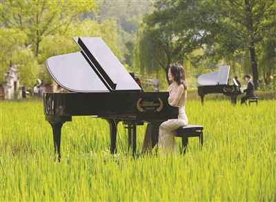 8月5日,在张家界黄龙洞风景区,钢琴爱好者在稻田中演奏。