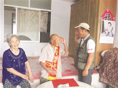 “田爷爷,我是从河北保定来的郑新忠,特意向您表达对抗战前辈的敬仰之情。您当年不怕流血牺牲,赶走侵略者,是民族英雄,更是我们学习的榜样。”郑新忠为老人戴上了印有“抗日老兵民族脊梁”的绶带。