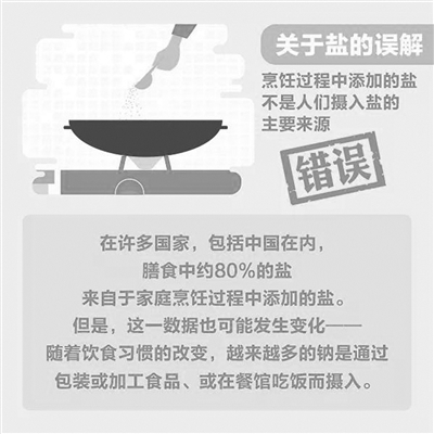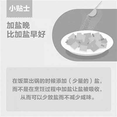 “盐不过6”从厨房开始,在我国,超过80%的钠是通过在家做饭加盐而摄入的。晚加盐比早加盐好,在饭菜出锅的时候添加少量的盐,而不是在烹饪过程中加盐,让盐被吸收,从而可以少放盐而不减少咸味。
