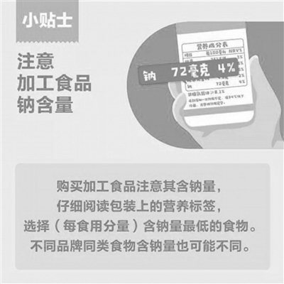预包装和加工食品含盐量很高。检查标签,留心含盐量。中国的食品标签是按每100克所含的营养成分进行标示的,所以在计算所选食品是否含盐过高时,可能需要一些小技巧。 (萱 萱)