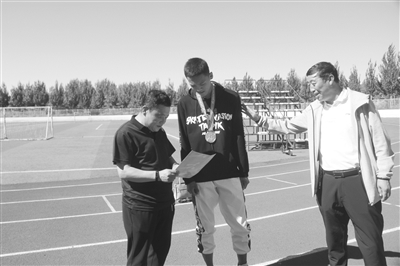 在刚刚结束的省第十八届运动会上,镇赉县代表团选派的16岁运动员陈兴华在乙男五项全能(110米栏、铅球、跳高、跳远和1500米)比赛中获金奖。今年7月,陈兴华在省青少年田径锦标赛上曾获得少年乙组五项全能第一名的好成绩。图为陈兴华听取教练指导。 田宏摄